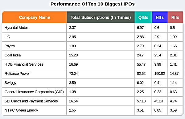 For instance, Hyundai, although the largest IPO, only witnessed a 2.37 times subscription. LIC had recorded 2.95 times subscription, while NTPC Green Energy and Paytm saw 2.55 times and 1.89 times subscription. Swiggy, a new-age tech company, also has 3.59 times the subscription.