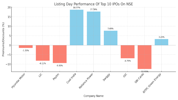 5 out of these top 10 IPOs have listed at a discount. HDB Financial Services will list on BSE and NSE next week. A double-digit premium listing was seen in Coal India and Reliance Power, which are decades-old IPOs. Post-COVID, Swiggy is the only one to manage a single-digit 7.7% premium listing.