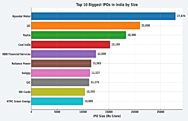 The biggest IPO of India was worth Rs 27,870 crore, which was launched in October 2024, by Hyundai Motor India. The second and third largest IPOs are of LIC and Paytm, worth Rs 21,008 crore and Rs 18,300 crore, with launch timelines in May 2022 and November 2021.