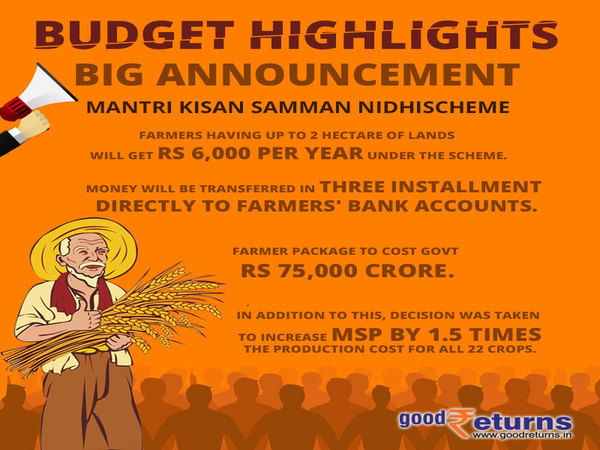 Under Pradhan Mantri Kisan Samman Nidhi, 6000 rupees per year for each farmer, in three installments, to be transferred directly to farmers' bank accounts, for farmers with less than 2 hectares land holding: FM Shri Piyush Goyal