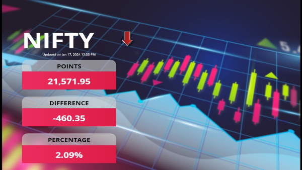 Sensex witnessed a drastic drop of 1,628 points, closing at 71,501, while Nifty recorded a decline of 460 points, settling at 21,572. The Nifty Bank fared even worse, witnessing a staggering fall of 2,061 points to conclude at 46,064. The Midcap Index also felt the impact, losing 516 points and closing at 47,152.