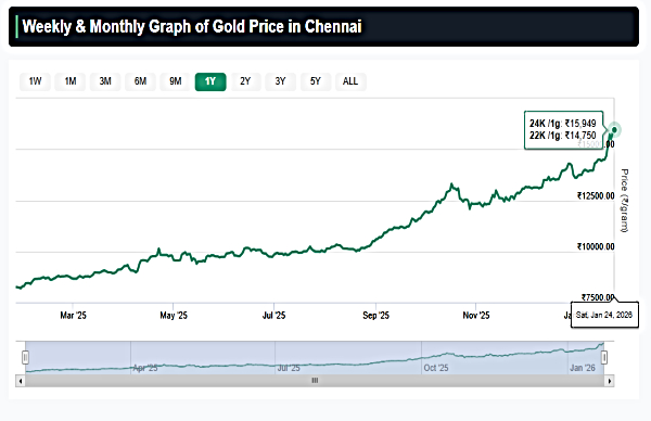 In January 2026 so far, 22 carat gold has risen by nearly 19%, beating 24 carat gold who recorded an upside of 17.2% in Chennai. Gold rates in this city have started the new year with a big bang.
