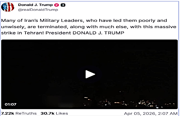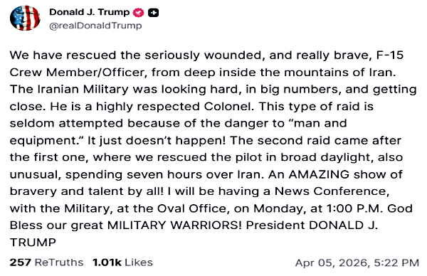 Trump's last post is just few minutes ago. He said, "We have rescued the seriously wounded, and really brave, F-15 Crew Member/Officer, from deep inside the mountains of Iran. The Iranian Military was looking hard, in big numbers, and getting close. He is a highly respected Colonel. This type of raid is seldom attempted because of the danger to "man and equipment." It just doesn't happen! The second raid came after the first one, where we rescued the pilot in broad daylight, also unusual, spending seven hours over Iran. An AMAZING show of bravery and talent by all! I will be having a News Conference, with the Military, at the Oval Office, on Monday, at 1:00 P.M. God Bless our great MILITARY WARRIORS! President DONALD J. TRUMP."