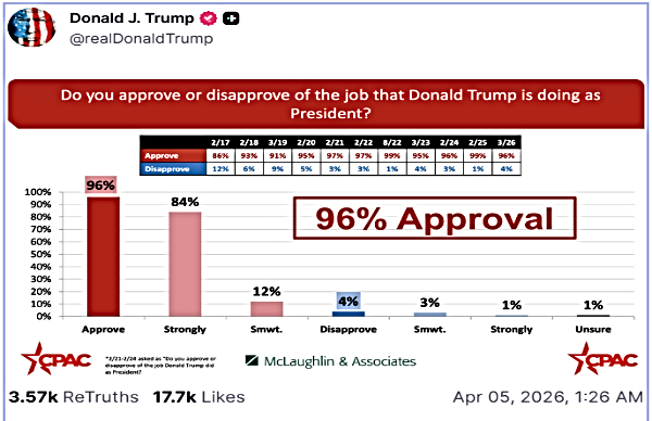 He even published a result of new poll where citizens were asked whether US President Donald Trump is doing his job as President. He flaunted the 96% approval rate proudly!