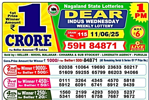 Nagaland Lottery For Dear Indus 1:PM On June 11, 2025, Prize Winners: