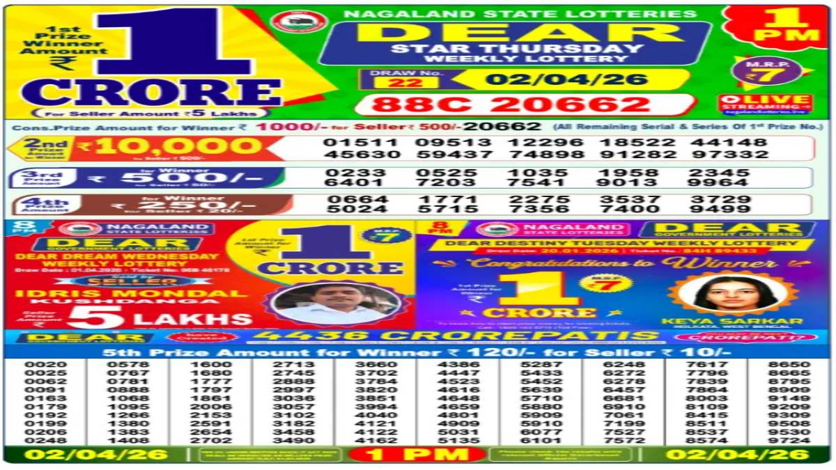 The Nagaland State Lottery is set to announce its much-awaited Dear Lottery Sambad results for Thursday, April 2, 2026, with three draws scheduled throughout the day. Participants across the country are eagerly waiting for the outcomes of the Dear STAR Morning (1 PM), Dear SUPREME Day (6 PM), and Dear FAME Evening (8 PM) lotteries, each offering a top prize of Rs 1 crore.