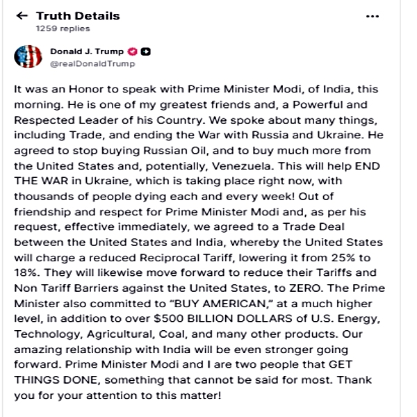 PM Modi also confirmed about the trade deal in a late-night post. Through his X account, PM Modi said, "Wonderful to speak with my dear friend President Trump today. Delighted that Made in India products will now have a reduced tariff of 18%. Big thanks to President Trump on behalf of the 1.4 billion people of India for this wonderful announcement."