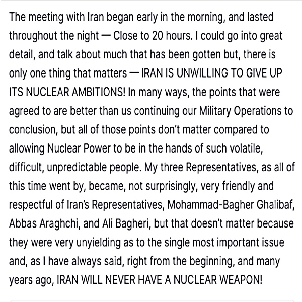 US President Donald Trump, through his Truth Social, said, "The meeting with Iran began early in the morning, and lasted throughout the night - Close to 20 hours. I could go into great detail, and talk about much that has been gotten but, there is only one thing that matters—IRAN IS UNWILLING TO GIVE UP ITS NUCLEAR AMBITIONS!"