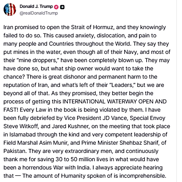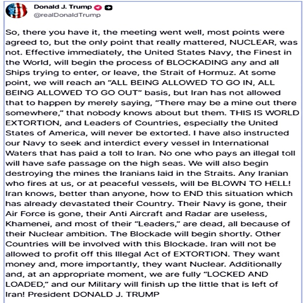 Trump added, "We will also begin destroying the mines the Iranians laid in the Straits. Any Iranian who fires at us, or at peaceful vessels, will be BLOWN TO HELL! Iran knows, better than anyone, how to END this situation which has already devastated their Country. Their Navy is gone, their Air Force is gone, their Anti Aircraft and Radar are useless, Khamenei, and most of their "Leaders," are dead, all because of their Nuclear ambition. The Blockade will begin shortly."