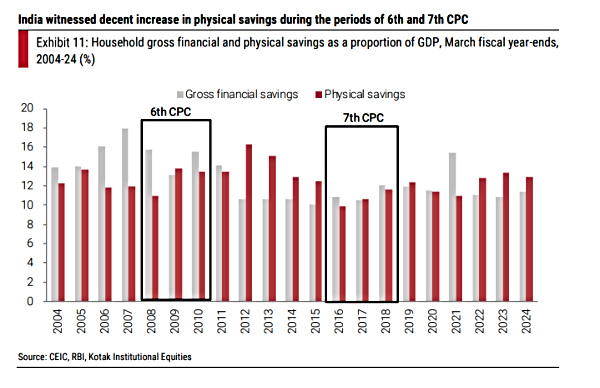 A more underrated impact of pay commissions had been on the savings front. Adding, Kotak's note explained that physical savings improved post the implementation of the past few pay commissions, while gross financial savings improved post 7th CPC. At the same time, we note a sharp increase in allocation toward equities in gross financial savings of Indian households, during those periods.